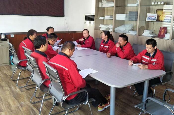 2018年5月14日星期一,喷胶棉分厂顺利召开中层干部管理会议,中层管理例会上,刘博主任针对安全生产方面做了细致的分析和建议,提出“安全责任重于泰山”的思想,大家都在非常认真的学习。